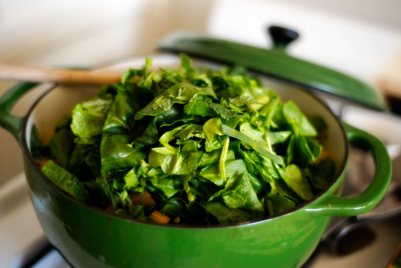 Let that simmer about ten minutes, and then add your leafy greens (spinach and chard) and allow to cook about five minutes – and your soup is ready!