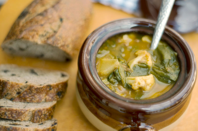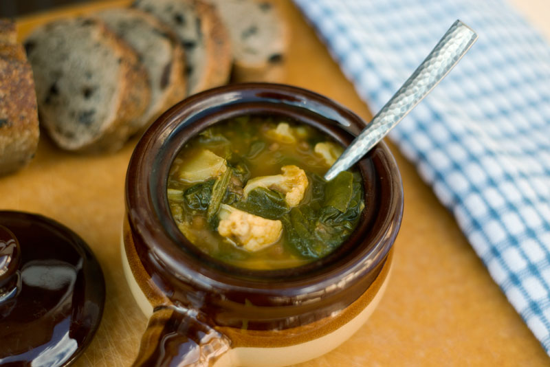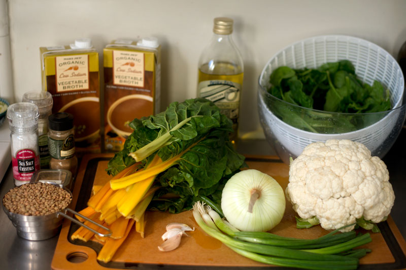 Here’s what you need – chard, scallions, garlic, an onion, spinach, cauliflower, chicken broth, spices, and lentils, of course. Get the full recipe here.