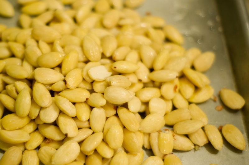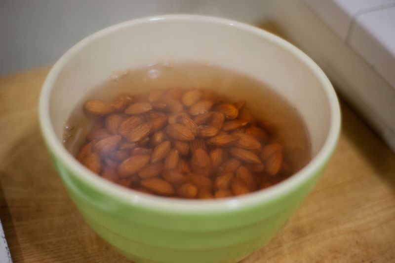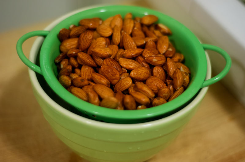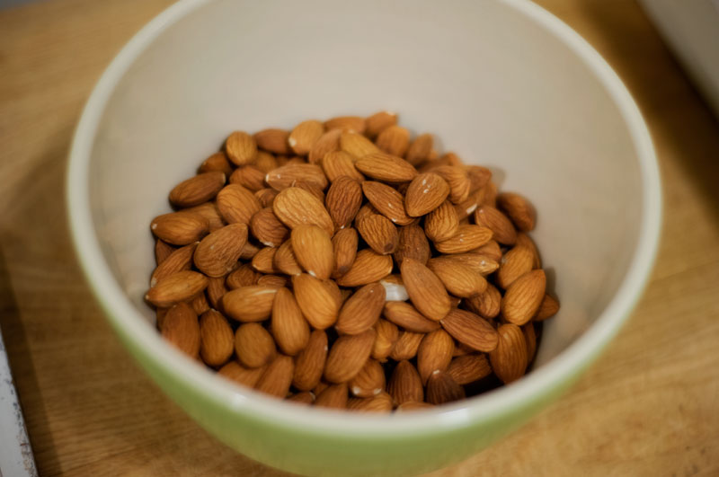 I also learned in the process how to blanche almonds for skin-removal. First, you boil some water. Then, you put your almonds in a bowl.