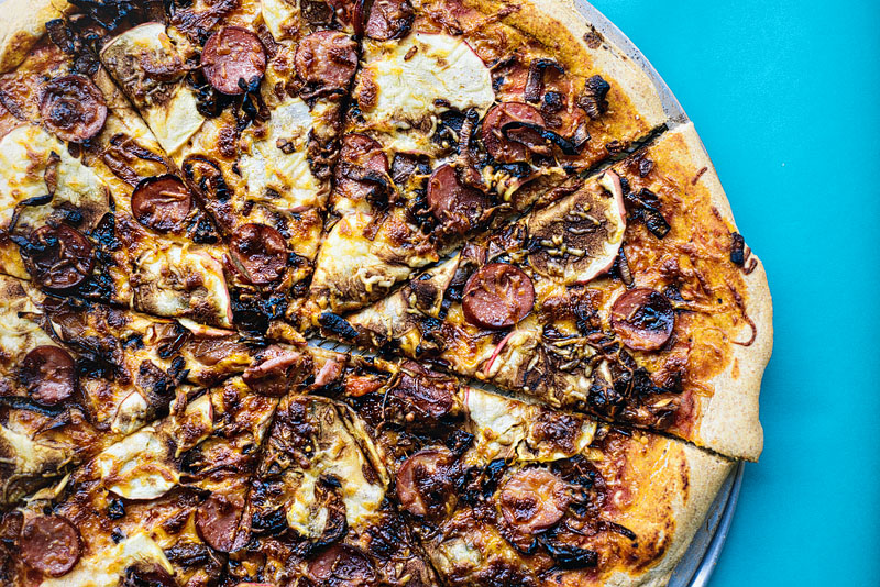 This past weekend, we made a whole wheat pizza with turkey kielbasa, apple, caramelized onion, and balsamic reduction. Below, you’ll find our recipe using Hodgson Mill ingredients and a chance for you to win a $25 Hodgson Mill pizza prize pack.