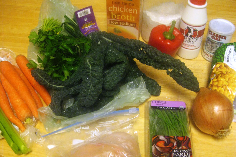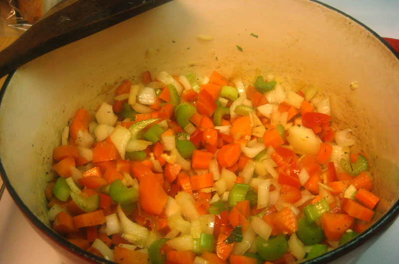Next up, we loaded the chopped vegetables (minus the corn, peas, and kale) into an oiled pot, and sauteed them up.