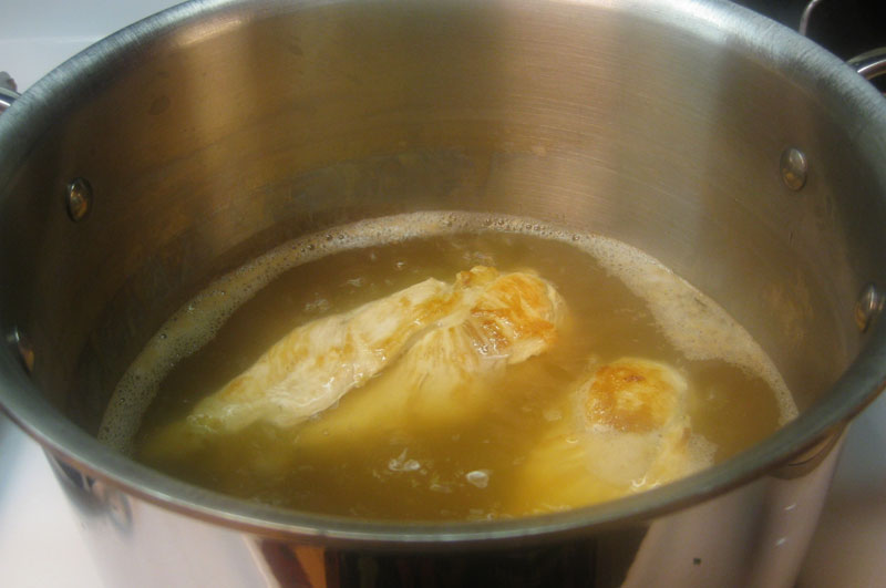 You start by browning a couple of chicken breasts (or thighs, or whatever you happen to have hanging around), and then finishing them off by poaching them in boiling water.