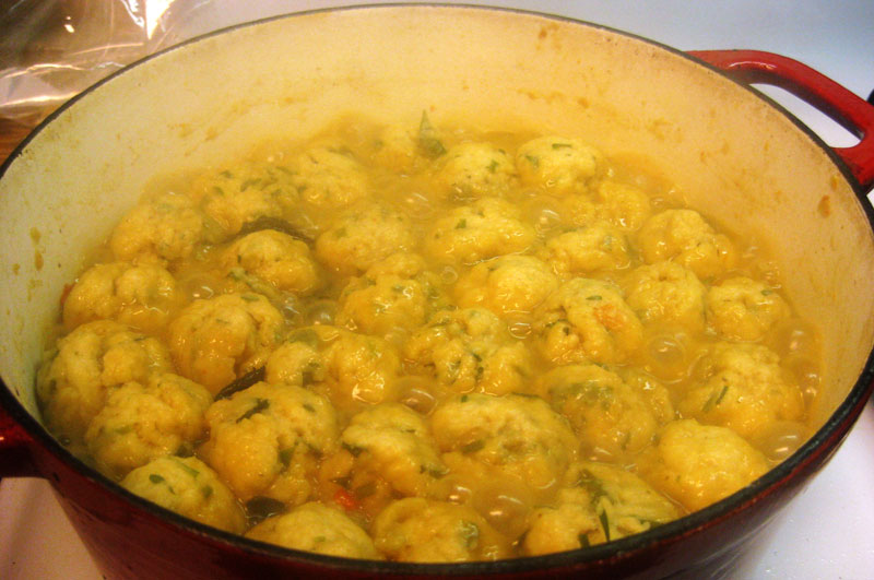 As far as the dumplings, we followed the recipe exactly, using all-purpose flour, but if we did it again, I’d make the dumplings smaller and try the cake flour for a fluffier dumpling.