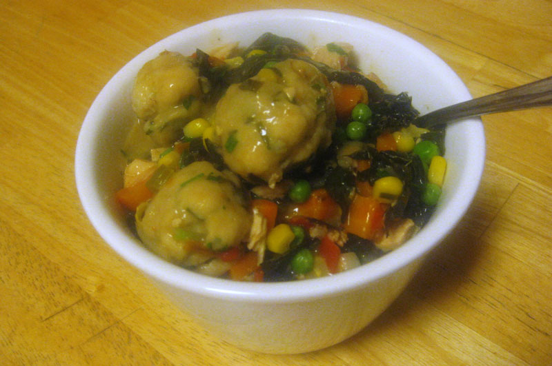 Quick note: We actually added the torn up kale, corn, and peas right before nestling the dumplings in the pot and covering them up for a quick nap. This is the way to do it, since you don’t want to overcook any of the vegetables that don’t take long to finish.