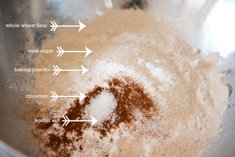 Go ahead and preheat your oven to 400 Then, put your dry ingredients into a bowl, and mix well.