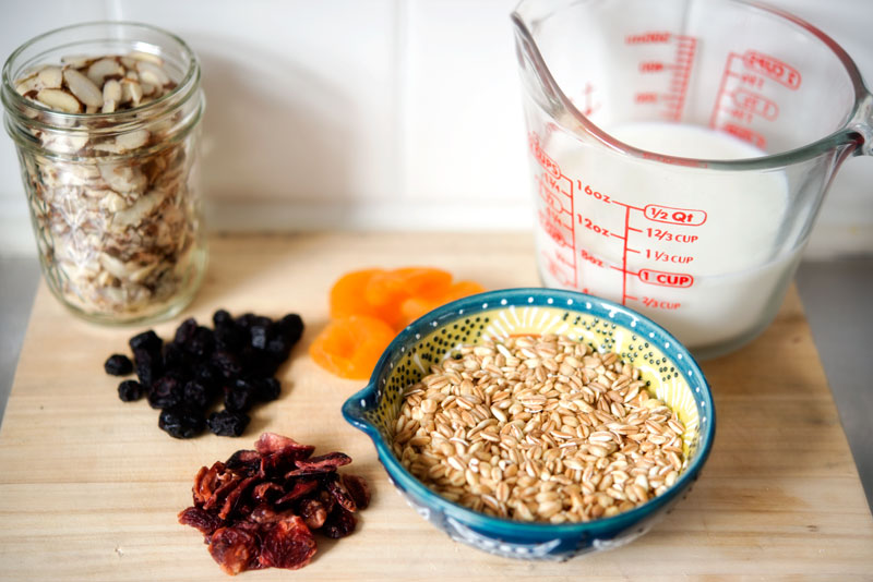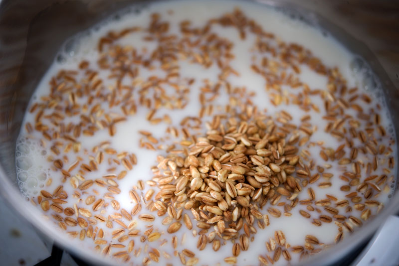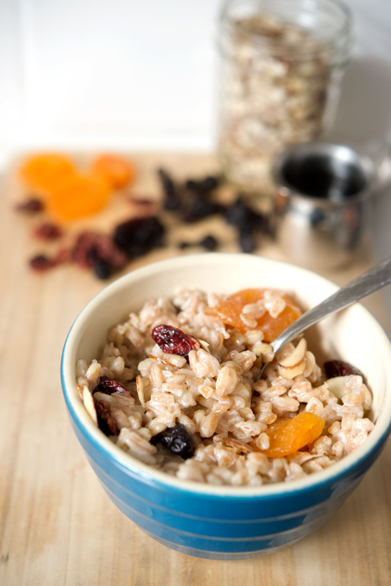 Here’s what you do: Boil 1/2 cup farro over high heat in milk. Lower heat, cover, and simmer for 10 minutes. Remove from heat and let sit for 5 minutes. Stir with a fork, and pour into bowl. Top with dried (or fresh) fruit, slivered almonds, and agave. Serve warm.