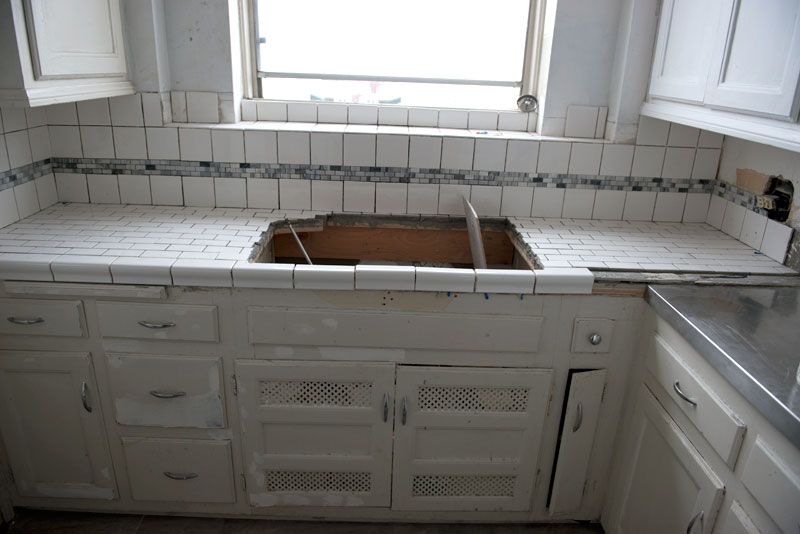 Day 3 was plumbing – after they ripped everything out, there was some behind-the-scenes work that happened (ie, replacing the pipe that was leaking, and all the pipes for the sink.) This involved going into our attic – which I didn’t even know we had – and pulling out the pipe. After Day 4, this is what our kitchen looked like – tile placed, but no sink!