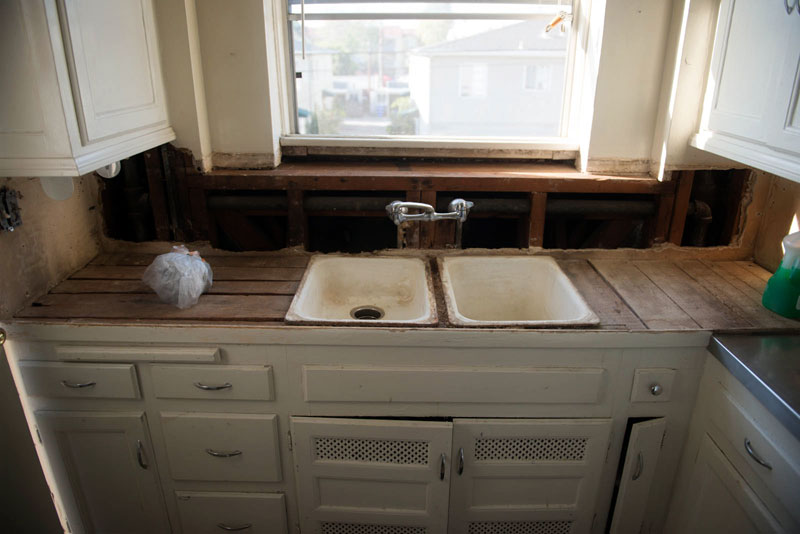 Here’s our old fixture – the faucet came out of the wall instead of from the sink. Also, notice how the sink basins were two separate sinks. This made them very hard to clean, plus they were quite old, so that didn’t help much.