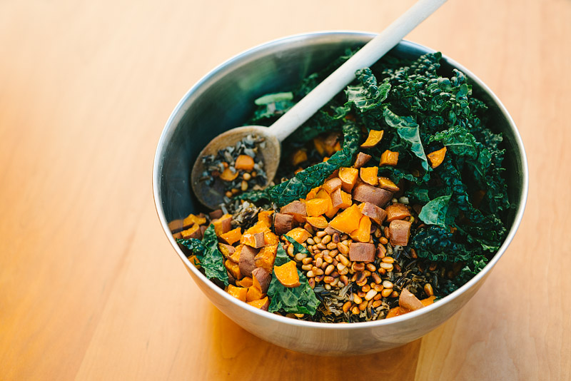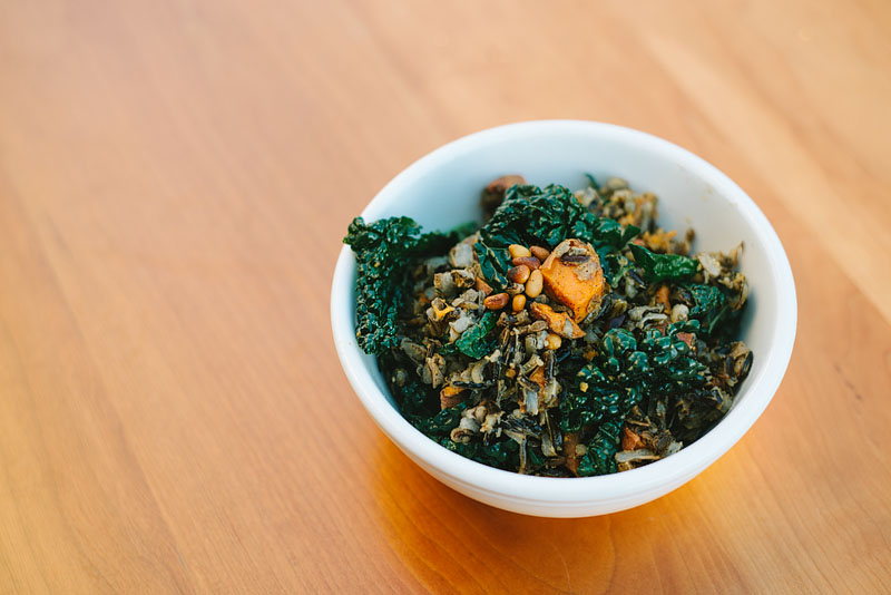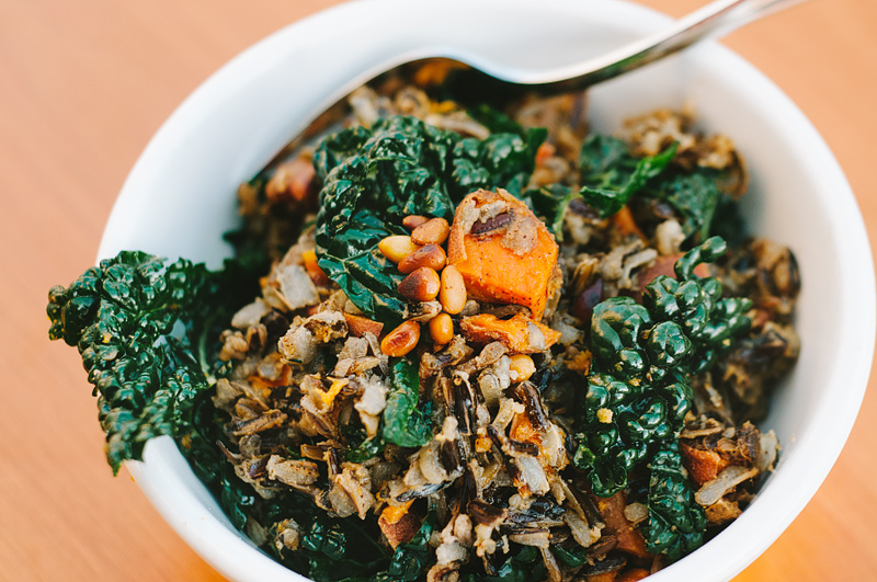 If you have kale in your clutches, you should make this pilaf! Here’s what you do. Take one cup of wild rice, two to three small sweet potatoes, a fourth-cup of pine nuts, and a bunch of kale, and get ready for a good time.