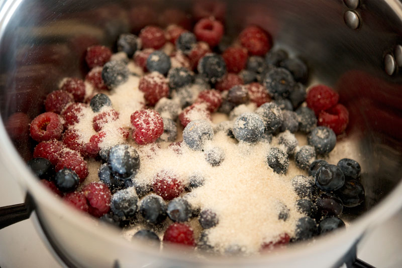 Put about a quarter cup of sugar on the stove (over low heat) with about half a cup of blueberries and a quarter cup of raspberries. Cook over low heat until your blueberries begin to burst – your raspberries will turn into liquid much faster, and you’ll have a jelly-like substance on your hands.