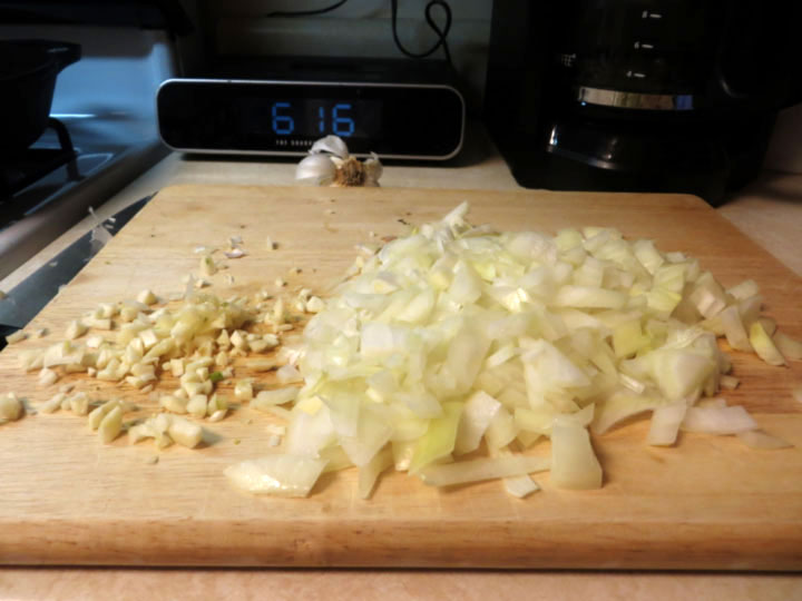 I started with an onion and four cloves of garlic, and minced everything up while listening to questionable Taylor Swift songs on repeat.