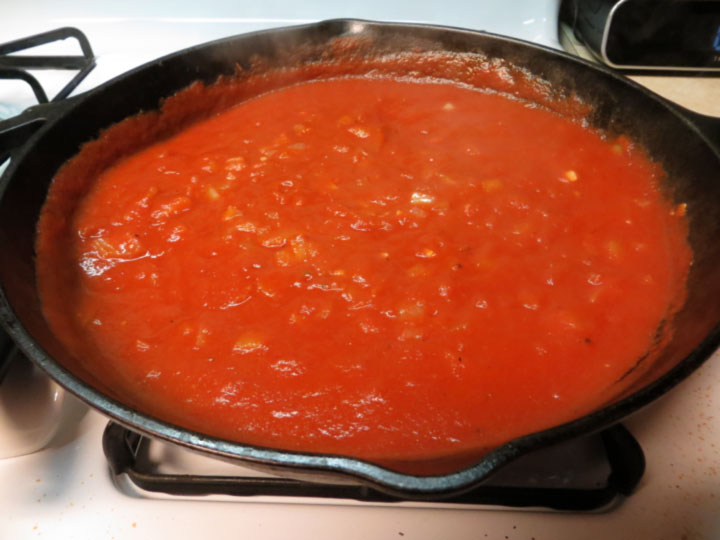 A couple minutes into this, I threw in two cans of tomato sauce, procured by Trader Joe’s, lowered the heat so tomato sauce wasn’t splattering everywhere, and read a book for 20 minutes.