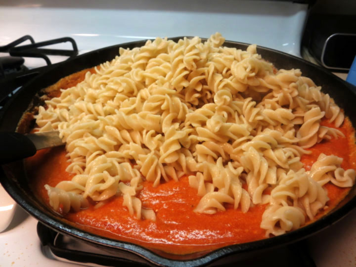 At this point, stir the pound of pasta into the delicious sauce, and stir it all around.