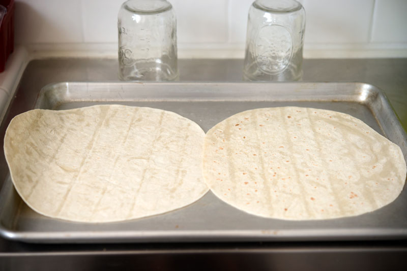 Start with some tortillas – I had flour ones, from when we’re going to make chicken quesadillas. Which is also a delicious dish. You should make it – or come over, and I’ll show you how!