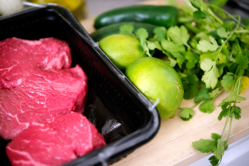 Now you have to decide who is going to cut up the meat and who will start the dough. Terri chose the dough, I chose the meat. Terri is actually much better at dough preparation. So the dough is as follows.