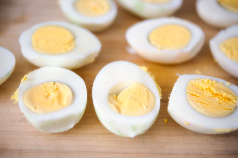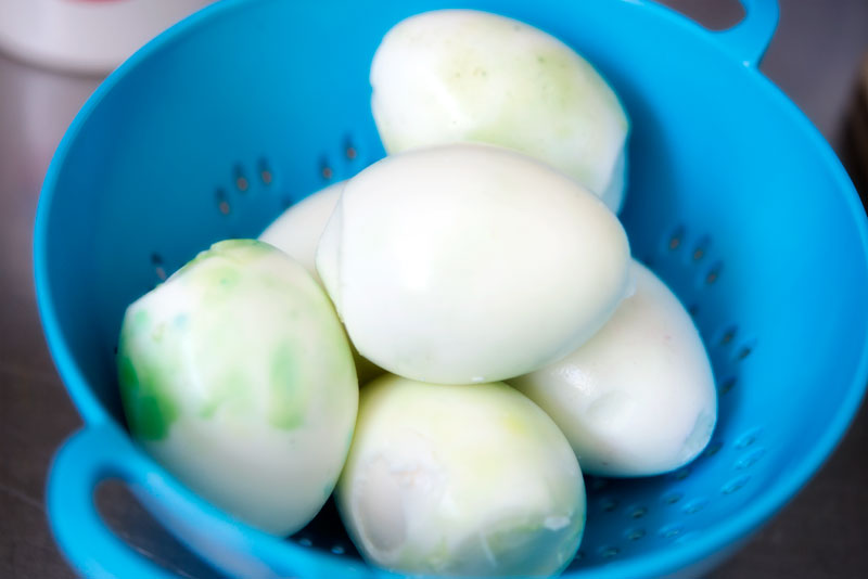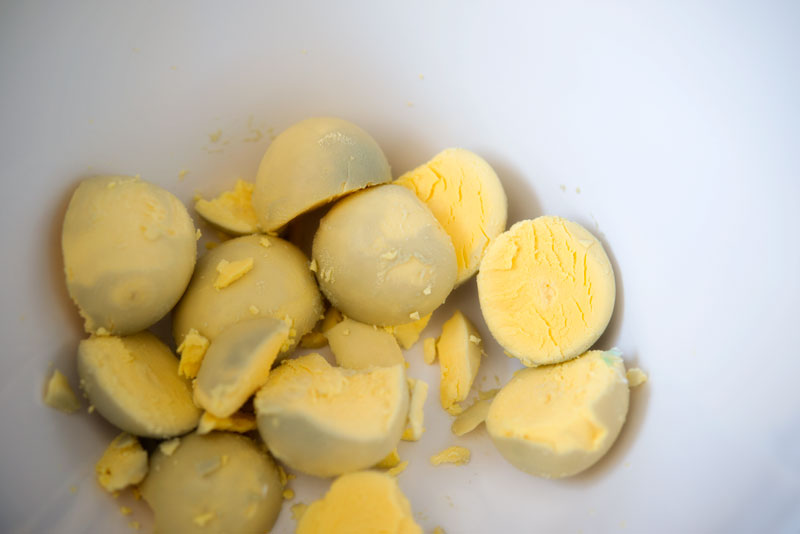 Once the meat is sliced and chopped mix it in a big bowl and then add the eggs – 18 of them as we took liberty with the recipe. It is easier to mix it with your hands folding the meat and cheese into the eggs.