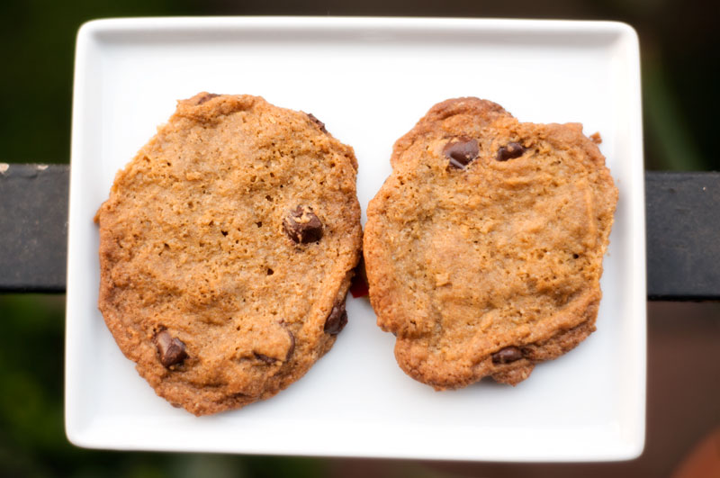 Now, as I am currently cleaning out my kitchen pantry in preparation for a big move, I was a little short on baking supplies. Once I realized what I thought was cornstarch was in fact cornmeal and not helpful, I was left with two options: bread flour or whole wheat flour. All was not lost and hopeless though. I can now say with full confidence (after having eaten a completed cookie,) whole wheat flour was the way to go! Here is my adaptation on super chocolate chocolaty cookies.
