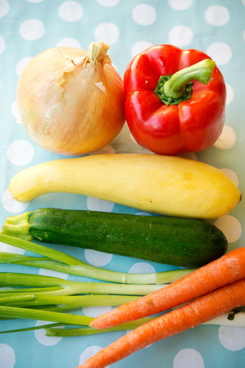 1. Chop ALL veggies (this might take a few minutes – make some friends help!) Coat the pot(s) with olive oil. Add in all veggies and garlic. Add salt and pepper.