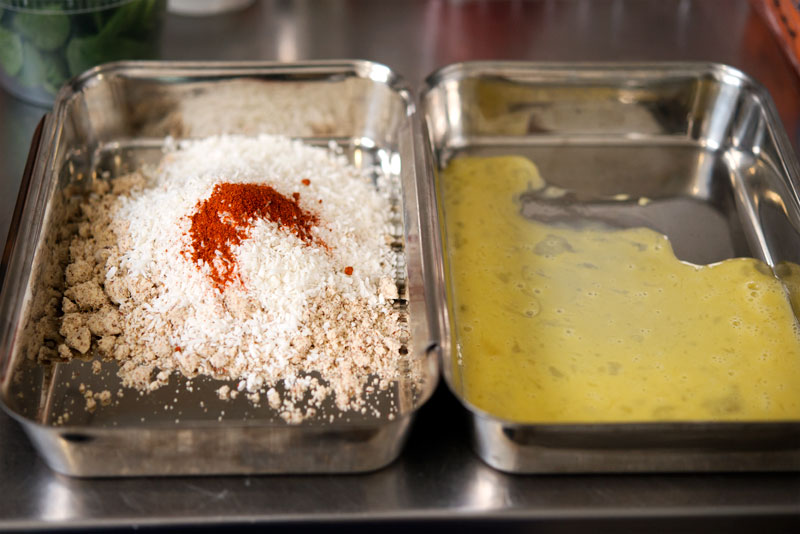 Set aside and mix together the almond meal, coconut shreds and cayenne pepper (also cut back on the cayenne pepper if you are not a fan of spicy. This amount will give it a big kick). Salt and pepper to taste.