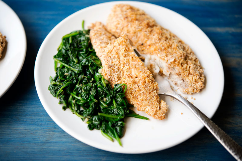 Dredge each fish fillet in egg and then press into the almond meal mixture. Once both sides of the fish are covered, place on a lightly greased baking sheet (I typically use coconut oil). Bake for 15 minutes at 450. Fish should be flaky and break apart easily.