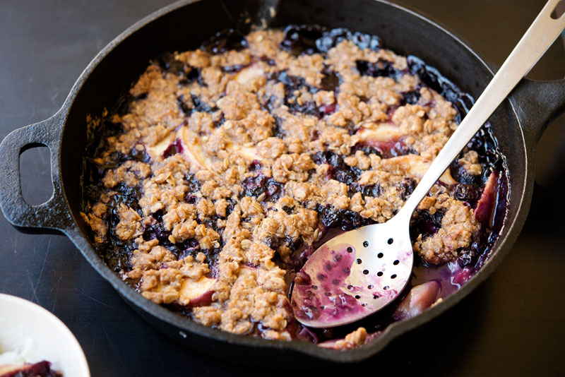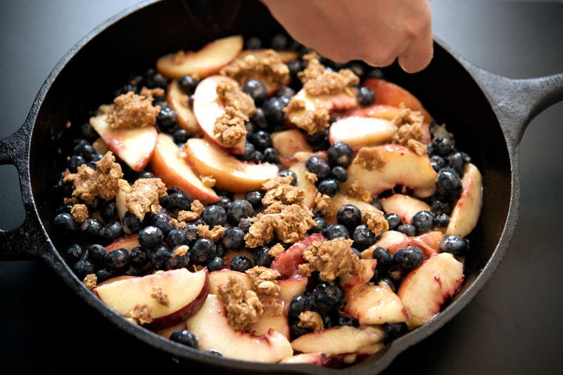4. Place the fruit mixture in a 2 quart ceramic or glass baking dish. Sprinkle the crumble mixture evenly over the fruit. Place the pan on a baking sheet pan lined with a Silpat or parchment paper and bake for 40 to 45 minutes, or until the tops are browned and crisp and the juices are bubbly. Serve warm or at room temperature.