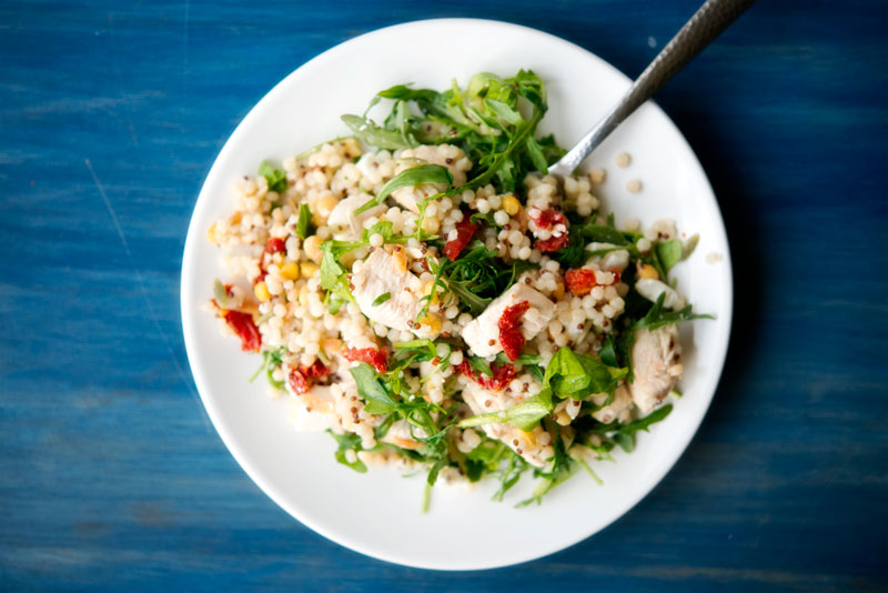 4. Put arugula in a bowl, wilt using hot harvest grains, add chicken, feta, and sundried tomatoes. Top with juice of two lemons and mix well.
