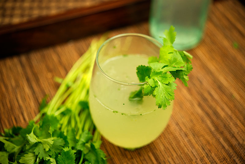 Grab your cocktail shaker again and start by dropping in the mint leaves and a lime wedge into it. Use your muddler to crush these two elements together. Then add your sugar, five cilantro sprigs, and two more lime wedges into the shaker and continue to muddle until all the elements have been sufficiently broken down. At this point you will be getting that earthy sweet balanced smell I was talking about above. Then you want to add your ice and your rum. Stir the mixture vigorously until the sugar has dissolved. Then grab a glass filled with ice and strain the contents into it. Top off the glass with a little club soda and give it a quick stir. Add your remaining cilantro sprigs to the top of the glass as a garnish and you’re ready to go!