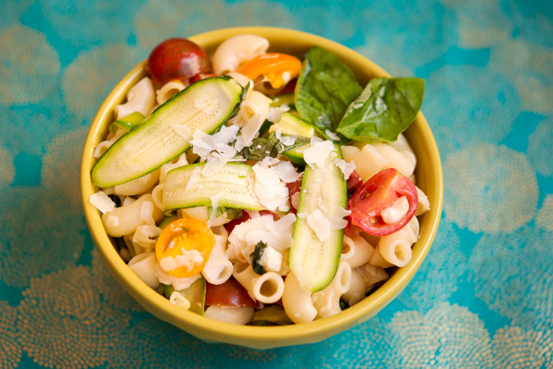 5. Mix water with lemon juice, toss with pasta. Add veggies, parmesan cheese, and mix well. Salt and pepper to taste.