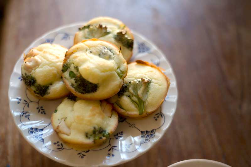 5. Add two tablespoons of the mix to each of your greased muffin tins. Then add one to two tablespoons of your chicken and vegetable mixture.