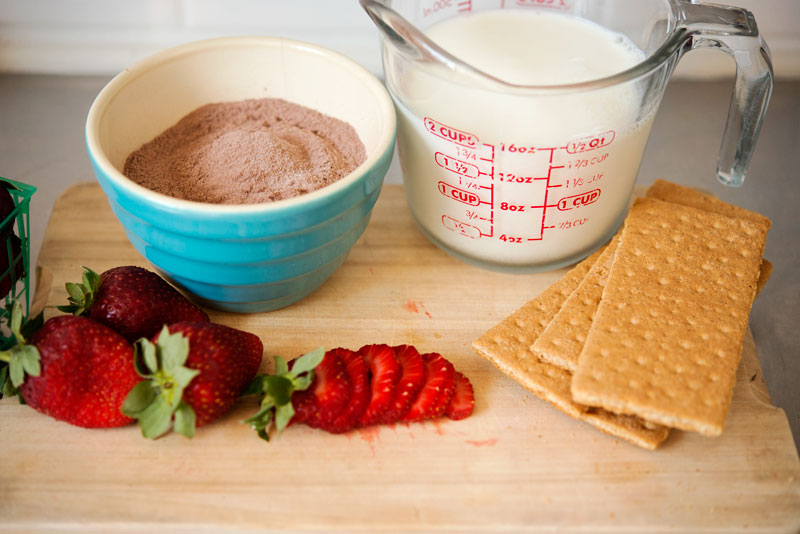 All you really need is milk and pudding mix, grahams, and strawberries. Or bananas, if you eat them. Your choice! For this, I used two packages of pudding (six cups of milk), two pints of strawberries, and 12 sheets of graham.