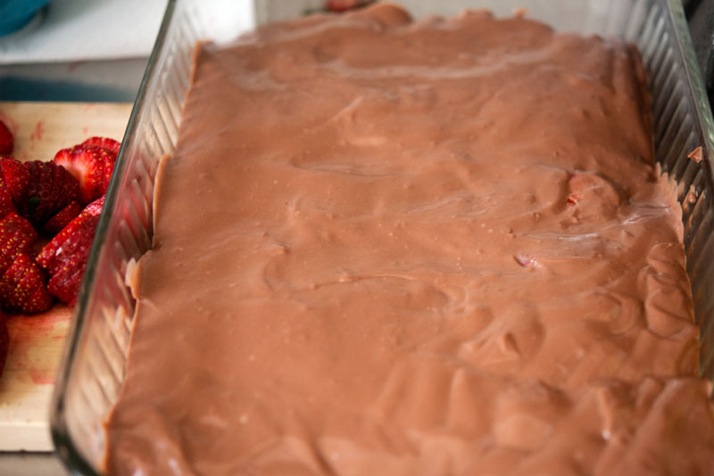 Now, add a layer of pudding. Repeat, so you have two layers of each. Feel free to change up the graham to strawberry to pudding ratio as you feel it in your heart.