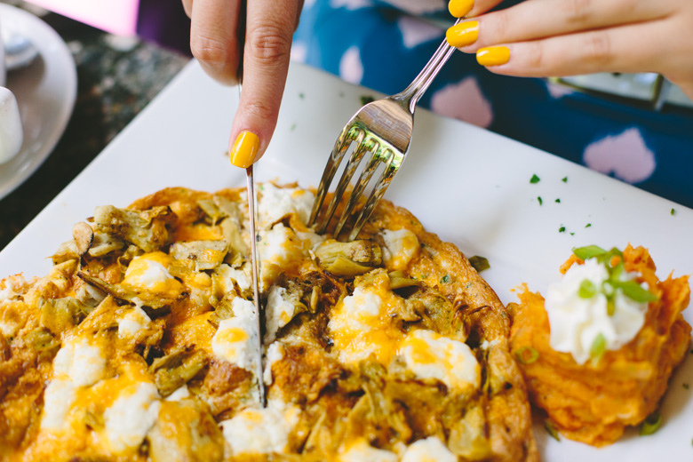 There was once a magical time when my BFF (and our resident vegetarian contributor), Rebecca, came to visit Los Angeles. As you may know, she’s currently residing in London, so it was a mega treat having her back home! Eating breakfast is one of our favorite things to do together – typically we order something vegetarian-friendly that both of us are excited to try, and then we share. It’s a perfect partnership. Cafe Verona on La Brea was the perfect spot for this BFF breakfast adventure!