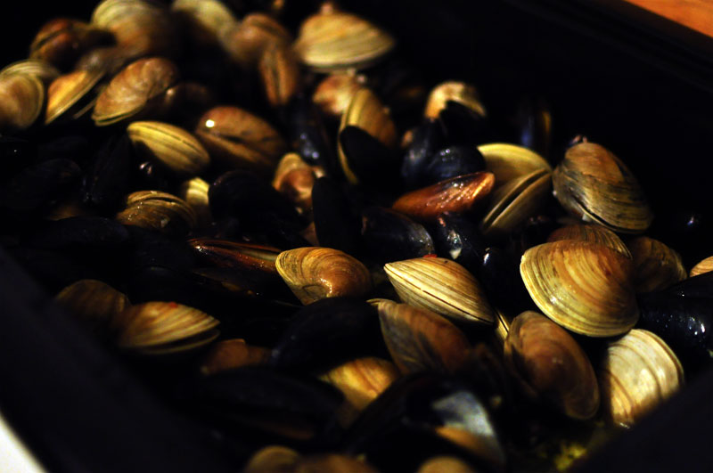 Here are the mussels and clams – steamed. Tip on steaming clams/mussels/shellfish – any that are open when you start, toss – these are dead. Any that don’t open whilst steaming, or those with broken shells, toss – these could be bad too!
