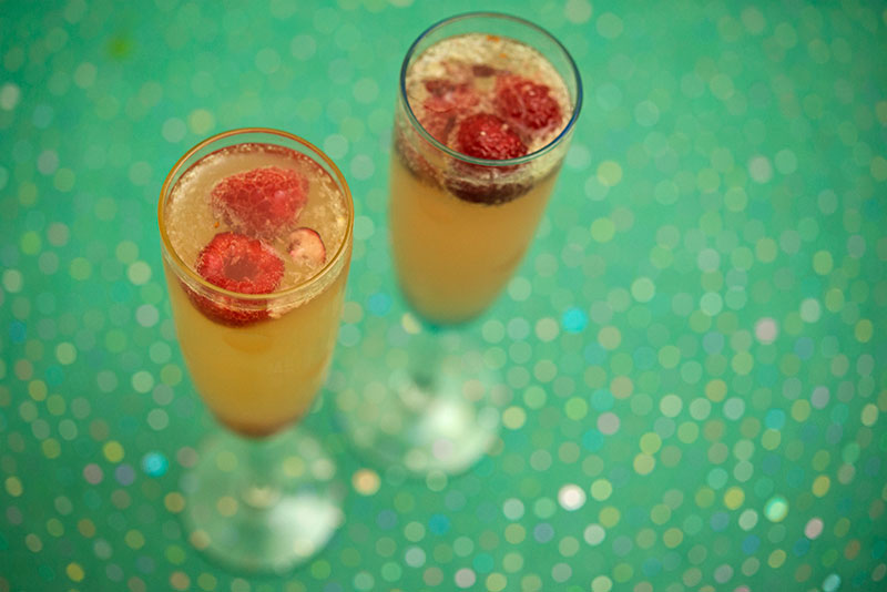 Grab your cocktail shaker and start by adding in the sugar, the lime juice, the fresh cranberries, and the vodka. Then take your handy muddler and crush all these elements together. You will want to make sure that your cranberries are good and pulverized so that as much of the juice is released from the berries as possible. Add your ice cubes and shake vigorously for a few moments. Then grab two champagne flutes and strain half the contents of your mixture into each glass. Fill up the rest of your flutes with the sparkling wine and drop in the fresh raspberries for a sweet garnish. This simple drink is easy to make, with a beautiful sparkling balance of sweet and sour. A great way to cool down while your slaving over that holiday stove.