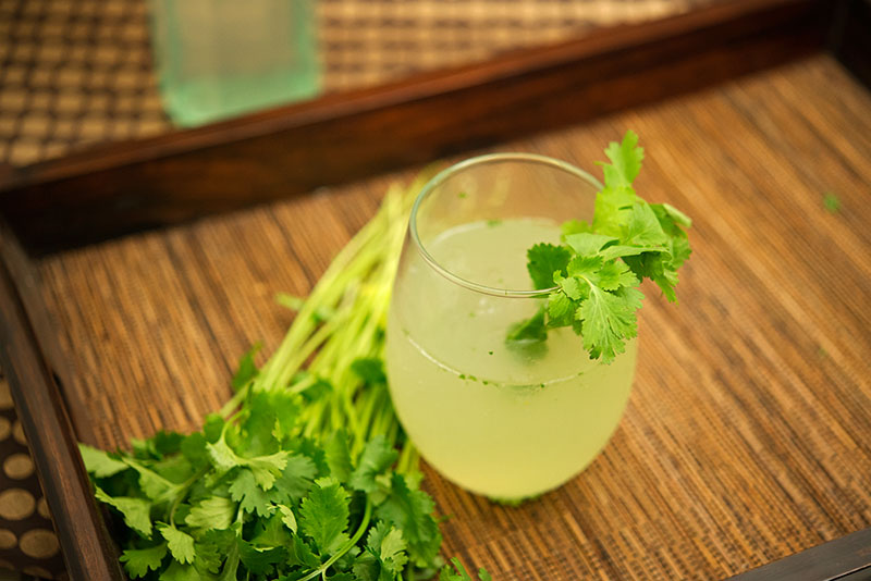 Grab your cocktail shaker again and start by dropping in the mint leaves and a lime wedge into it. Use your muddler to crush these two elements together. Then add your sugar, five cilantro sprigs, and two more lime wedges into the shaker and continue to muddle until all the elements have been sufficiently broken down. At this point you will be getting that earthy sweet balanced smell I was talking about above. Then you want to add your ice and your rum. Stir the mixture vigorously until the sugar has dissolved. Then grab a glass filled with ice and strain the contents into it. Top off the glass with a little club soda and give it a quick stir. Add your remaining cilantro sprigs to the top of the glass as a garnish and you’re ready to go!